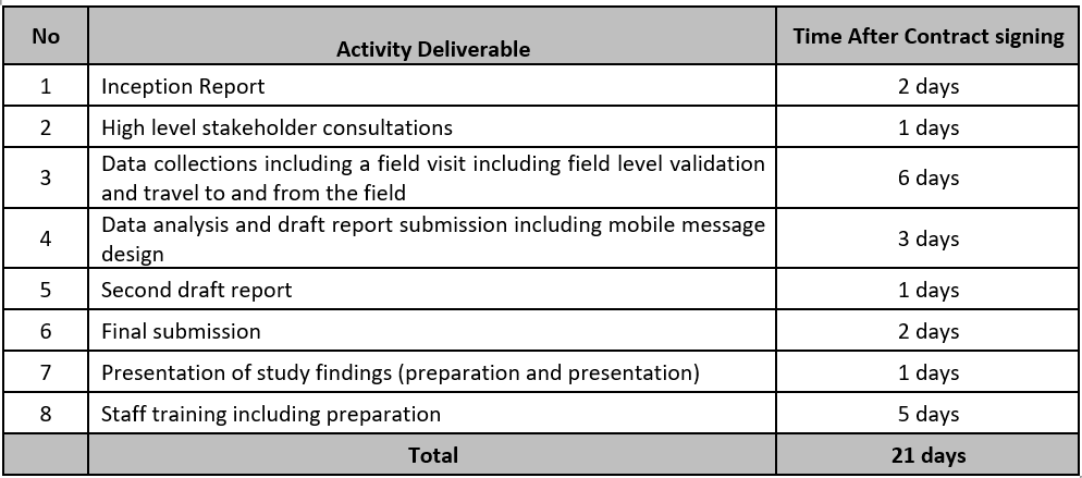 The project will need to be completed within the below explicitly mentioned time frame. The consultancy period is 21 calendar days.