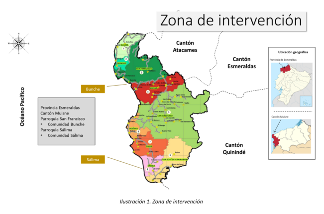 El proyecto: “Mujeres liderando la producción resiliente al cambio climático y la gestión sostenibles de los manglares de Bunche, Salima y de la Reserva Marino Costera Galera San Francisco”; se implementa en el cantón Muisne, provincia de Esmeraldas en Ecuador, proyecto que busca mejorar la resiliencia al cambio climático de las familias de las áreas de custodia de manglar de Bunche y Sálima y de la Reserva Marino Costero Galera San Francisco, mediante la conservación de sus recursos naturales, la producción sostenible, el empoderamiento de las mujeres y el fortalecimiento institucional.