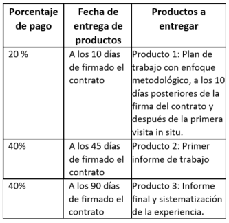 La forma de pago será por entregable de cada producto, debiendo tener la aprobación de la entidad contratante (de acuerdo con la característica de cada producto), para proceder con la gestión del pago.