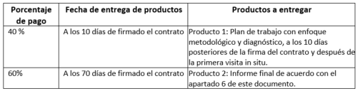 La forma de pago será por entregable de cada producto, debiendo tener la aprobación de la entidad contratante (de acuerdo con la característica de cada producto), para proceder con la gestión del pago.