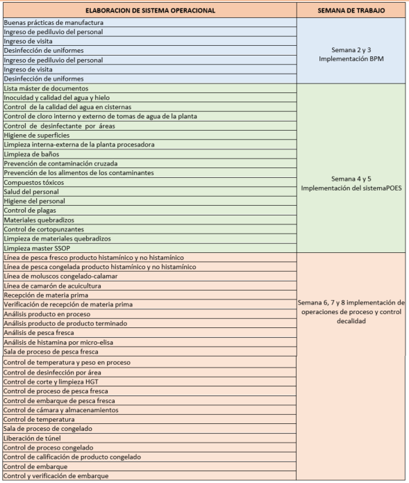 El profesional que ejecute desarrollara la implementación documental del sistema de gestión basada en las normativas internacionales de pesca y elaboración del producto del mar para su comercialización.