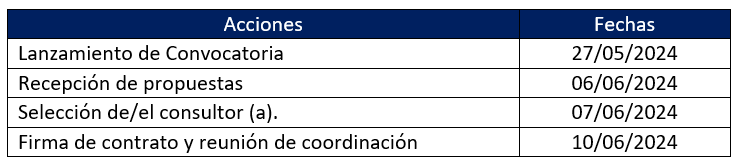 El calendario del servicio a contratar deberá formar parte de la propuesta, integrando un detalle de las tareas a realizar. En cualquier caso, el objetivo es que la totalidad de los productos hayan sido entregados a más tardar 30 de Agosto 2024.