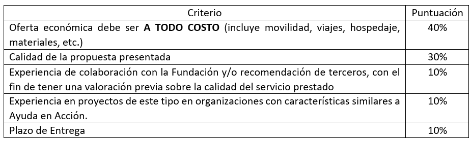 En caso de requerir información para desarrollar la propuesta a presentar, no duden en ponerse en contacto con nosotros al correo: sliulla@ayudaenaccion.org, mmalvas@ayudaenaccion.org, ryarleque@ayudaenaccion.org