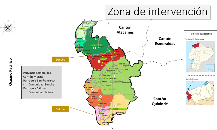El proyecto se desarrollará vinculando a las 6 organizaciones de pescadores del cantón Muisne, Asociación de producción pesquera Río Salima; Asociación producción pesquera San José de Chamanga; Cooperativa de pescadores artesanales 30 de agosto; ASOPESBUNCHE, ASOPESANJOCHA, ASOPESARISA.
