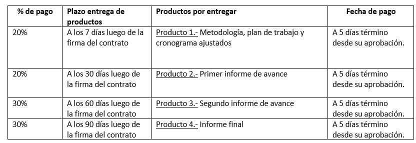 La forma de pago será por entregable de cada producto, debiendo tener la aprobación de la entidad contratante y de la Coordinación del Proyecto, (de acuerdo con la característica de cada producto), para proceder con la gestión del pago.