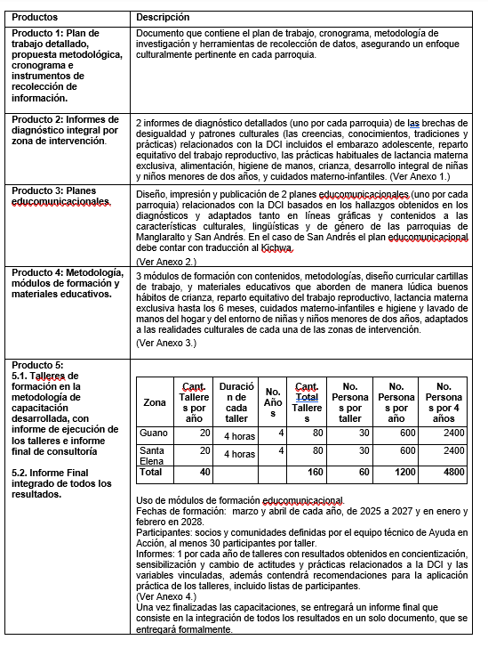 El equipo consultor debe considerar que el aporte de los diagnósticos será la identificación de los patrones culturales y brechas de desigualdad relacionadas a la DCI, y el diseño de dos planes educomunicacionales en las parroquias San Andrés, provincia de Chimborazo y Manglaralto, provincia de Santa Elena.