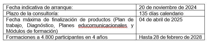 Se deberá definir una metodología para la construcción participativa de los temas y mensajes clave del plan educomunicacionales que debe incluir la promoción de hábitos de crianza, prácticas de lactancia materna exclusiva, alimentación, cuidados materno-infantiles, higiene de manos, reparto equitativo del trabajo reproductivo, embarazo adolescente; con un cronograma para su implementación en 44 meses.