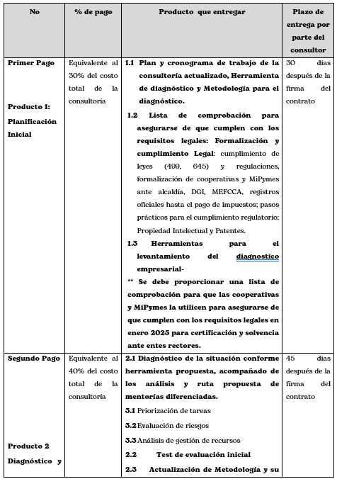 Considerando el tiempo de la consultoría se realizará un en varios pagos contra entrega en cada final de todos los productos.