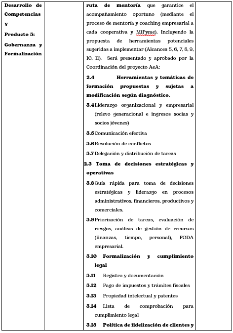 Proveer un servicio de mentoría y coaching para fortalecer las capacidades de mujeres y jóvenes asociados a cooperativas y MIPYMES del sector lácteo. El objetivo es desarrollar competencias en liderazgo organizacional y en la gestión y gobernanza interna empresarial asociativa a 2 Cooperativas) y/o individual 13 MIPYMES, en la gestión de recursos, y la implementación de planes estratégicos y operativos para la toma de decisiones.