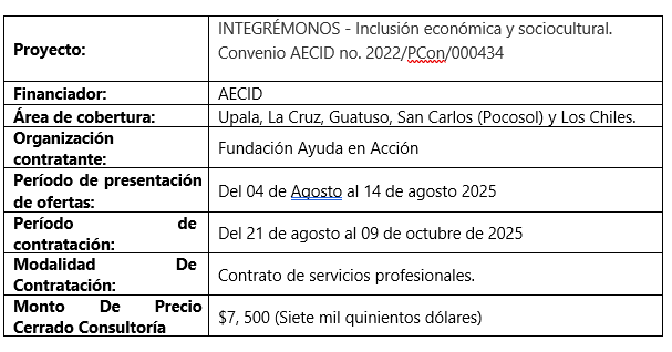 En caso de requerir información para desarrollar la propuesta a presentar, no duden en ponerse en contacto de forma electrónica a la dirección sjortega@ayudaenaccion.org con copia a jzeledon@ayudaenaccion.org aperez@ayudaenaccion.org y kcalderon@ayudaenaccion.org a más tardar el 14 de agosto 2025.