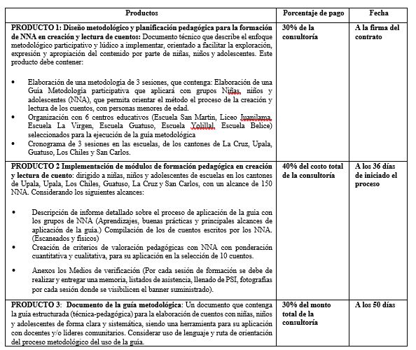 PRODUCTO 2 Implementación de módulos de formación pedagógica en creación y lectura de cuento: Dirigido a niñas, niños y adolescentes de escuelas en los cantones de Upala, Los Chiles, Guatuso, La Cruz y San Carlos, con un alcance de 150 NNA. Considerando los siguientes alcances: