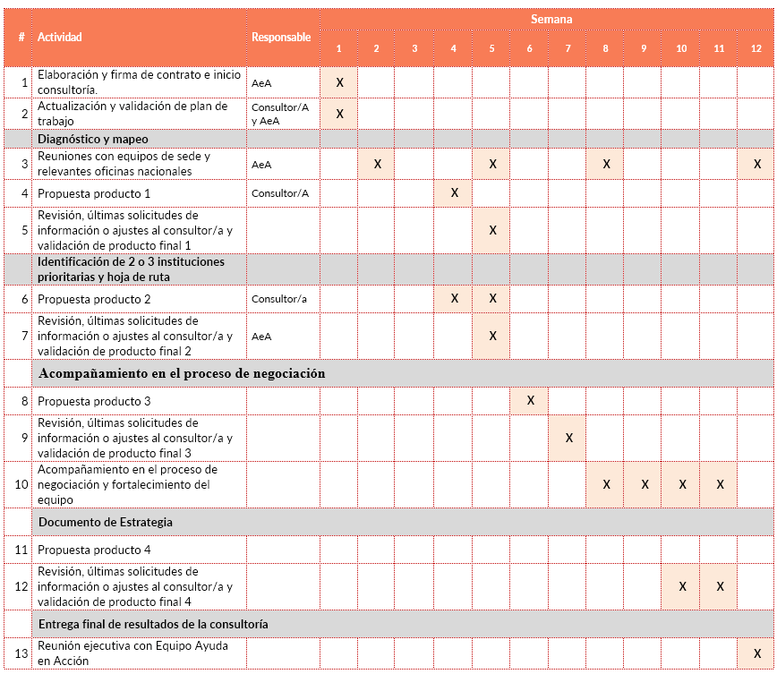 Diseñar una Estrategia de captación de fondos públicos para el Programa Nacional de Ayuda en Acción El Salvador, que considere la identificación de la oferta de recursos, el mapeo de actores relevantes, un análisis de viabilidad y de la normativa que rige la implementación de los fondos públicos, teniendo como meta convertirse en un socio confiable y eficiente para el diseño gestión e implementación de proyectos en coordinación con las instituciones estatales, desde un enfoque de derechos humanos, género e infancia.