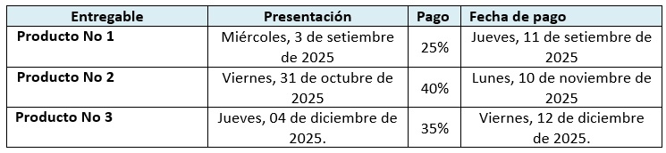 El calendario del servicio a contratar deberá formar parte de la propuesta, integrando un detalle de las tareas a realizar, así como deadlines. En cualquier caso, el objetivo es que la totalidad de los productos hayan sido entregados a más tardar el 12 de diciembre del 2025.