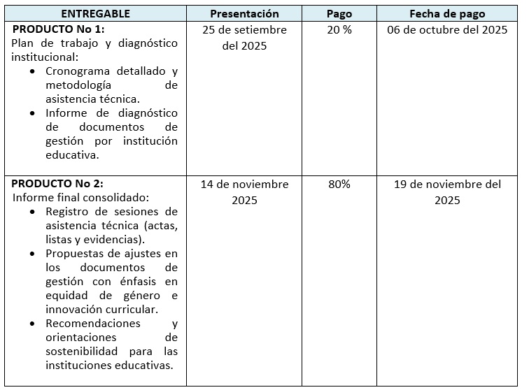 A continuación, se mencionan los documentos entregables, que por la temporalidad de las actividades que los generan, se consideran que los productos entregables sean un porcentaje de avance de las actividades, de ser posible en su conjunto, de acuerdo con el cronograma de trabajo y los hitos establecidos.