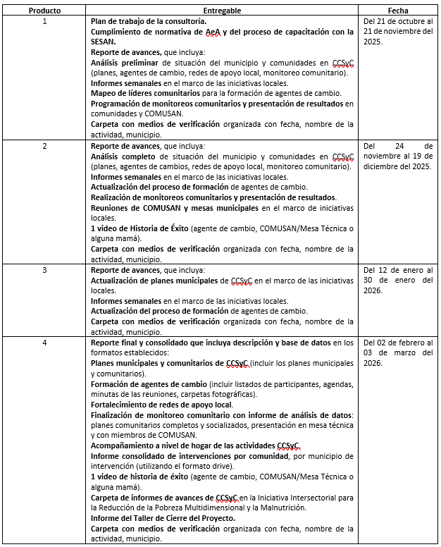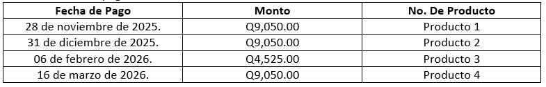 Contra entrega de los 4 informes de avances correspondientes para el cumplimiento de los cuatro productos detallados con anterioridad a razón del producto 1 y 2 un monto de Q9,050.00 cada uno, tercer producto Q4,525.00 y cuarto producto Q9,050.00, completando así un total de 4 pagos contra entrega y conformidad por parte de los supervisores de cada producto correspondiente. El contrato tendrá una duración de aprox. 4.5 meses, prorrogable según financiación del cooperante, sin embargo, del 22 de diciembre de 2025 al 9 de enero de 2026 se suspenderán actividades en campo por período de vacaciones en las instituciones.