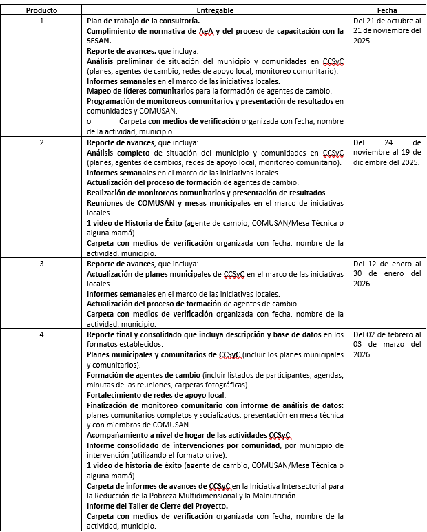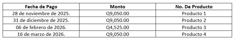 Contra entrega de los 4 informes de avances correspondientes para el cumplimiento de los cuatro productos detallados con anterioridad a razón del producto 1 y 2 un monto de Q9,050.00 cada uno, tercer producto Q4,525.00 y cuarto producto Q9,050.00, completando así un total de 4 pagos contra entrega y conformidad por parte de los supervisores de cada producto correspondiente. El contrato tendrá una duración de aprox. 4.5 meses, prorrogable según financiación del cooperante, sin embargo, del 22 de diciembre de 2025 al 9 de enero de 2026 se suspenderán actividades en campo por período de vacaciones en las instituciones.