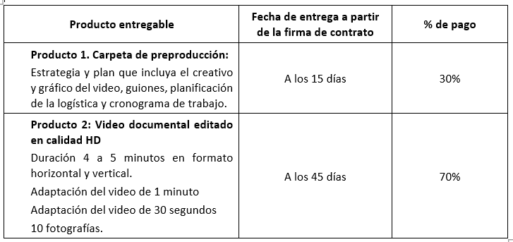 Para lo cual, se requiere contratar los servicios profesionales de una persona natural o jurídica para la producción de un video documental que resuma la completa gestión del proyecto: “Acceso a agua segura para 21 comunidades (19 sistemas de agua potable) de las provincias Carchi, Cotopaxi, Azuay y Morona Santiago”, iniciativa “Reto 10k”.