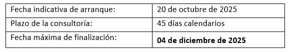 El calendario del servicio a contratar deberá formar parte de la propuesta, integrando un detalle de las tareas a realizar, un cronograma de trabajo y las fechas límite. En cualquier caso, el objetivo es que la totalidad de los productos se hayan desarrollado y entregado hasta el 4 de diciembre de 2025.