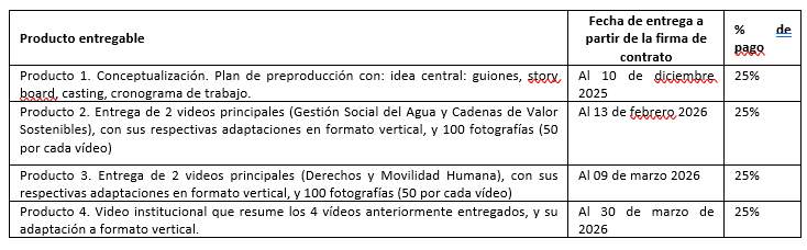 Contratar una agencia de publicidad/productora audiovisual o profesional de producción audiovisual para la producción de cinco videos principales con sus respectivas adaptaciones, y fotografías, destinadas a visibilizar el trabajo de Ayuda en Acción en Ecuador con un enfoque documental.