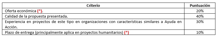 (*) En cuanto a los criterios, estos son los mínimos a incluir, para mayor información sobre otros posibles criterios a incluir, consulta el apartado de “criterios de selección de proveedores” que se desarrolla en la “Política de compras”. Sin embargo, a excepción de los criterios mínimos, que serán de obligatoria inclusión, el resto se modularán en función de las necesidades reales de cada proceso de compra.