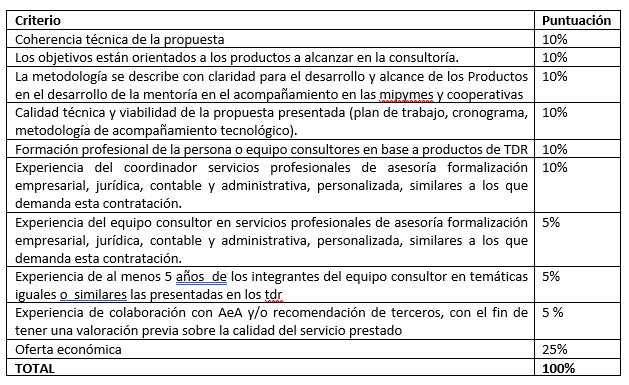 Bajo este marco, se proponen los presentes Términos de Referencia para la contratación de un proveedor de servicios para el acompañamiento y gestión de servicios legales y contables para formalización de pymes y cooperativas y gobernanza para la gestión empresarial, contribuyendo en la presentación de la documentación legal ante las instituciones reguladoras sectoriales (pymes y cooperativas) y la DGI, que soporte sus operaciones empresariales de rendición, de forma medible y transparente; favoreciendo así la inclusión económica de las personas vinculadas a los emprendimientos y pymes individuales y asociativos apoyados por AeA.