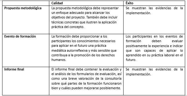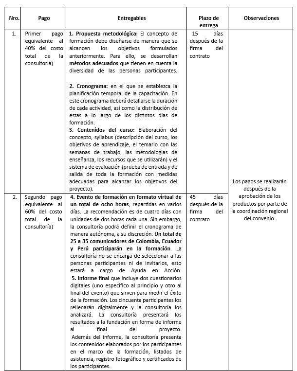 La formación está diseñada metódicamente como un modelo interactivo. Las personas participantes deben implicarse activamente. Por ejemplo, digitalmente trabajando en pequeños grupos con la ayuda de sesiones de break-out. La idea es aumentar la motivación y lograr un mayor efecto de aprendizaje desarrollando activamente el contenido en lugar de limitarse a escuchar. El análisis interactivo de casos prácticos en cada país, podría servir para reflexionar sobre los posibles retos del trabajo ético en los medios de comunicación. Además de impartir y fortalecer conocimientos, el curso también se centra en la aplicación práctica de lo aprendido mediante la elaboración de contenidos mediáticos propios en formatos autodefinidos (notas, vídeos, post, audio, infografía etc.). Los productos mediáticos pueden elaborarse en trabajo grupal (dividido por regiones). En cada grupo deberían participar entre 3 y 4 personas. Con ello se pretende crear un vínculo directo con la práctica laboral. Estos contenidos deben estar a disposición de la consultoría a más tardar en el momento de la entrega de los certificados. Estos serán entregados a Ayuda en Acción para la publicación en sus propios canales. Se espera que la consultora integre este modelo en su propuesta.