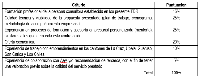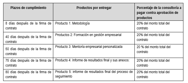 Los productos para el alcance de la contratación de la formación y mentoría a 08 nuevos emprendimientos (07 individuales y 01 familiar, con un alcance 12 personas en las comunidades de El Gavilán, Los ángeles de Moreno Cañas y Gallito en Pavón de Los Chiles) y 7 emprendimientos funcionando y apoyados por Ayuda en Acción en los años anteriores, ubicados en Upala, Los Chiles y San Carlos, con los siguientes Productos por entregar:
