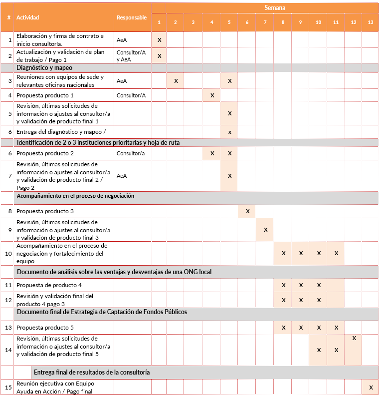 Diseñar una estrategia de captación de fondos públicos para el Programa Nacional de Ayuda en Acción Guatemala, que considere la identificación de la oferta de recursos-mecanismos de financiación, las principales líneas sectoriales, el mapeo de actores relevantes, un análisis de viabilidad y de la normativa que rige la implementación de los fondos públicos, teniendo como meta convertirse en un socio confiable y eficiente para el diseño, co-diseño, gestión e implementación de proyectos en coordinación con las instituciones estatales, desde un enfoque de educación para la vida, cambio climático e inclusión socioeconómica y otras líneas que puedan ser de interés de los actores Es importante que todo el análisis mantenga 3 niveles priorizados (Nacional, departamental y municipal)En la línea de las alianzas con el Gobierno, también es interesante poder identificar qué tipo de oportunidades hay para poderse presentar con el Gobierno a financiación, como por ejemplo el fondo de adaptación de cambio climático, en el que lo que se hace es formular con el Gobierno para presentarlo al Fondo verde