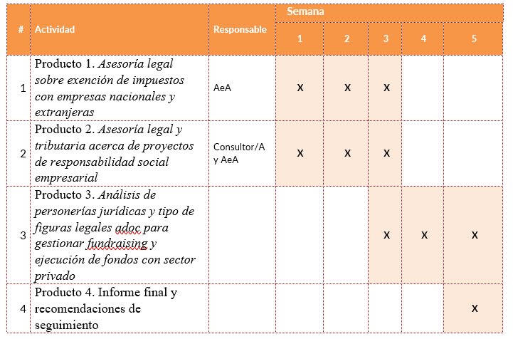 Desarrollar un análisis técnico–legal integral que permita a la organización comprender y aprovechar de manera estratégica las oportunidades de interacción, gestión de fondos y colaboración con el sector privado. La consultoría tendrá como propósito identificar las condiciones, exenciones tributarias, marcos regulatorios y figuras jurídicas más adecuadas para la ejecución de inversiones sociales y proyectos de responsabilidad social empresarial con empresas nacionales y extranjeras. Asimismo, deberá generar insumos, conclusiones y recomendaciones que faciliten la toma de decisiones institucionales para fortalecer el fundraising, la vinculación empresarial y la implementación de iniciativas con capitales de empresas de distintos orígenes y sectores económicos.