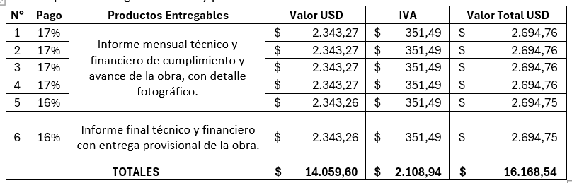 Según establece la normativa interna de Ayuda en Acción, el pago se lo realizará de la siguiente manera previo entrega de factura y productos: