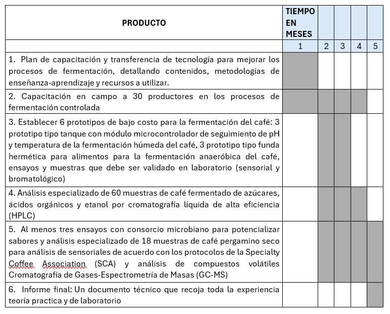 En el proceso del servicio técnico para potencializar la calidad del café contara con 6 prototipos de los cuales: tres 3 prototipo tipo tanque con módulo microcontrolador de seguimiento de pH y temperatura de la fermentación húmeda del café y tres 3 prototipos tipo funda hermética para alimentos para la fermentación anaeróbica del café, ensayos y muestras que debe ser validado en laboratorio (sensorial y bromatológico). Así mismo, 30 participantes en capacitaciones, entre productores socios de la REDCAFC y proveedores de las diferentes comunidades de la parroquia El Goaltal, Jijón y Caamaño, Espejo, Mira, provincia del Carchi
