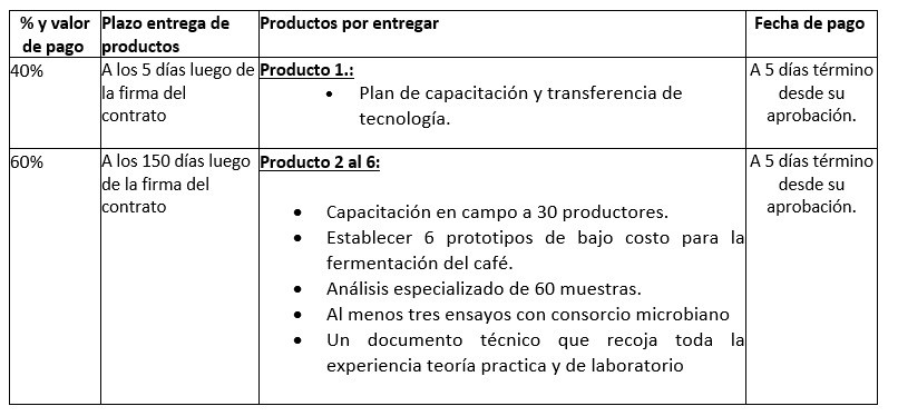 Contratar los servicios profesionales de un/a consultor/a o equipo consultor especializado para la agregación de valor mediante procesos de fermentación controlada que potencialice el café de los productores de café de la Red de integración Económica de caficultores del Carchi REDCAFC, con el fin de fortalecer las capacidades técnicas y productivas de los actores de la cadena de valor. De las comunidades de las parroquias de El Goaltal, Jacinto Jijón y Caamaño, cantón Espejo, Mira, Provincia del Carchi