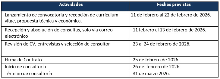 La consultoría será realizada por una persona natural o jurídica, ya sea nacional o extranjera cuyas operaciones sean en Perú y será seleccionada posterior a un proceso de concurso, después de que se haya divulgado los Términos de Referencia por medios institucionales digitales.