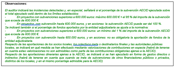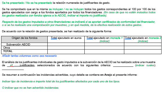 El auditor indicará si ha hecho comprobaciones sobre documentos originales, o fotocopias y si cuando pedía los originales de ciertas copias le eran facilitados. Deberá decir cual ha sido la muestra revisada de los justificantes acreditativos de gasto (número, volumen de euros, y porcentaje respecto a la subvención de la AECID). Se mencionarán cuantas comprobaciones adicionales hayan sido realizadas sobre el objeto del contrato,