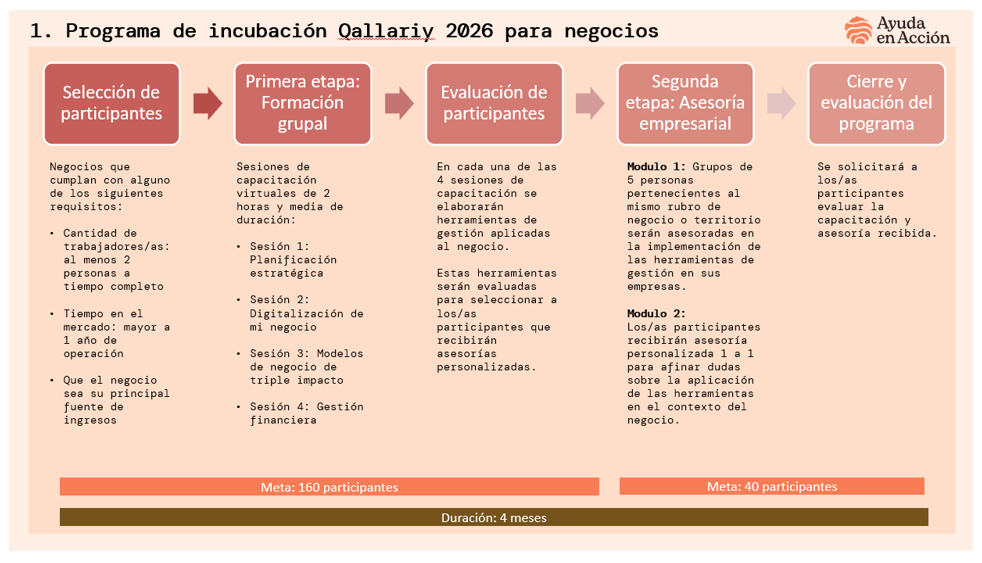En Perú contamos con el programa Qallariy Aceleradora, el cual busca promover el desarrollo territorial sostenible e inclusivo mediante el fortalecimiento del ecosistema empresarial y productivo, bajo un enfoque de triple impacto que articule crecimiento económico, bienestar social y sostenibilidad ambiental.