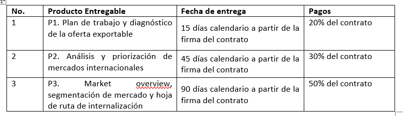 Una vez presentada la oferta que incluya todos los parámetros y características señaladas en los términos de referencia, se notificará al consultor o equipo consultor seleccionado, para firmar el contrato y a partir de esta fecha, tendrá un plazo de: 90 días calendario para la entrega de los productos solicitados.