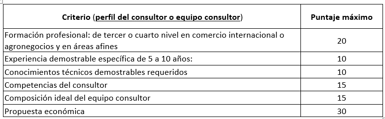 Consultor o equipo consultor: Profesionales de tercer o cuarto nivel en comercio internacional o agronegocios y en áreas afines: