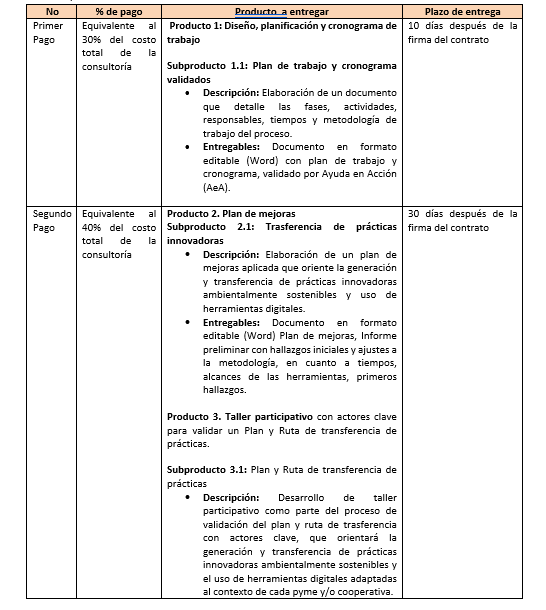 Una vez entregado los productos el equipo de AeA tendrán un lapso no mayor a 5 días calendario para revisar y brindar sus comentarios y propuestas de ajustes a producto e informe borrador, posteriormente el consultor/a tendrá tres días calendario para incorporar las observaciones que incluya los cambios sugeridos por el equipo de AeA.