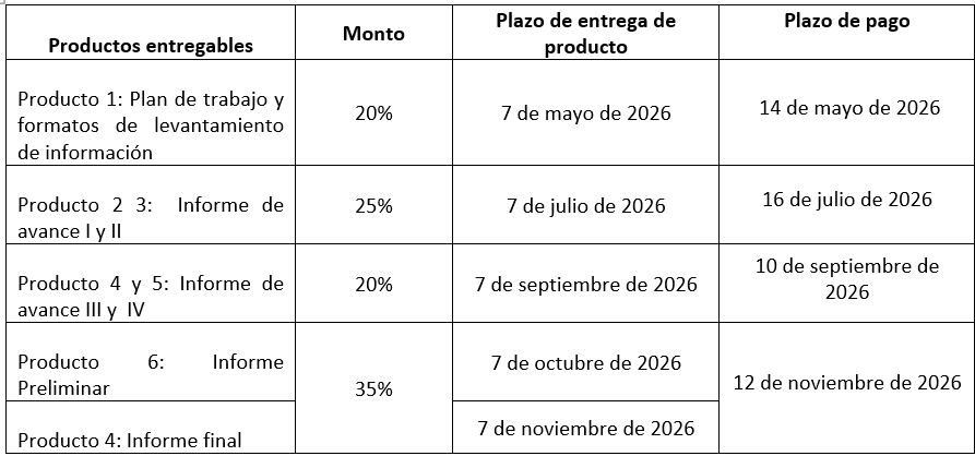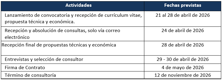 El calendario del servicio a contratar deberá formar parte de la propuesta técnica, integrando el detalle de las tareas a realizar, la secuencia de ejecución y las fechas límite correspondientes. En todos los casos, el servicio deberá desarrollarse conforme al cronograma establecido por la entidad contratante y a los plazos definidos para la entrega de productos. El inicio estimado de la consultoría será el 4 de mayo de 2026, culminando el 12 de noviembre de 2026.