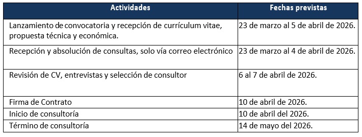 El calendario del servicio a contratar deberá formar parte de la propuesta, integrando un detalle de las tareas a realizar, así como deadlines.  En cualquier caso, el objetivo es que la totalidad de los productos hayan sido entregados a más tardar 8 de mayo del 2026.